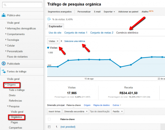Depois de ir em Fontes de tráfego, os próximos passos são “Origens”, “Pesquisa” e depois “Orgânico”. Em pesquisa orgânica aparecerão várias outras diretrizes que Elisa precisa clicar, como “comércio eletrônico” – além, é claro, de especificar as visitas e o tipo de métrica. Podemos ver todo esse caminho na figura abaixo: